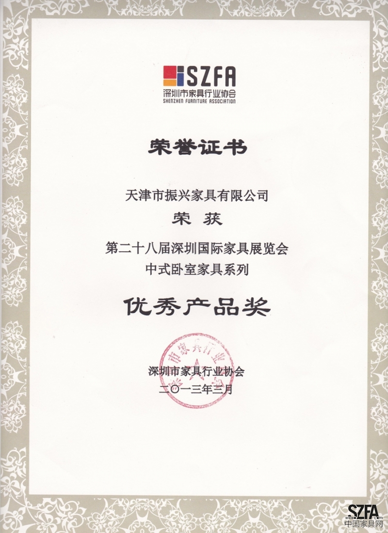 榮獲第二十八屆深圳國際家具展覽會中式臥室家具系列“優秀產品獎”。