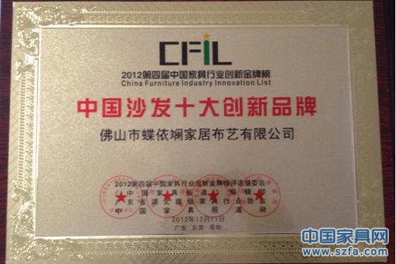 2012年12月11日,由《中國家具報道》發起,攜手《中國家具報道網》、《中國家具論壇網》聯合主辦的2012第四屆中國家具行業創新高峰論壇暨創新金牌榜頒獎典禮在東莞盛大舉行,來自全國家具行業的數百精英聚集一起共商家具業創新發展之策,廣東蝶依斕沙發繼2009年、2011年被評為中國沙發十大創新品牌后再次上榜“中國沙發十大創新品牌”。