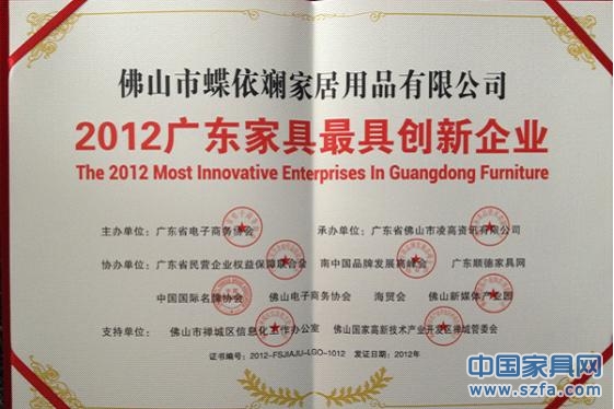 2012年12月28日,由廣東省電子商務協會舉辦的,廣東家具行業創新頒獎典禮在佛山舉行。數百家業內代表企業精英齊聚,共襄盛舉。佛山市蝶依斕家居用品有限公司榮獲2012廣東家具最具創新企業殊榮。