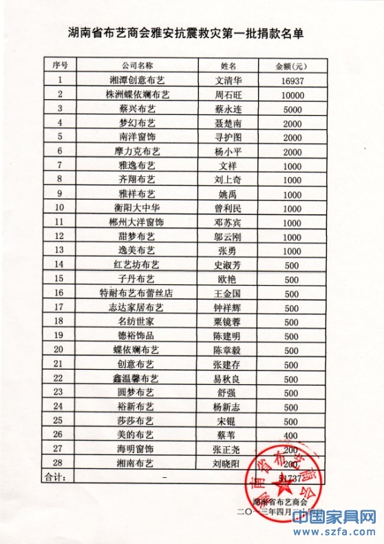 蝶依斕愛心人士參與湖南省布藝商會組織的雅安抗震救災