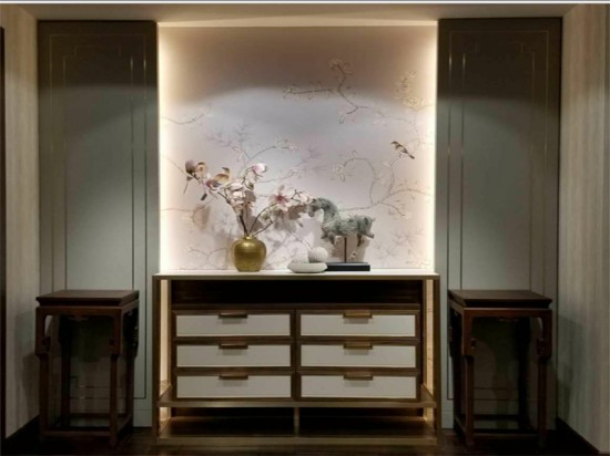 新中式玄關設計,以簡約的功能性家具作為主體,力求自然而不事雕琢,在少量的古典裝飾元素里,適當融入時尚大氣的現代設計語言,再搭配掛畫、器物、禪意花瓶等,來牽引出無限的空間想象。山水、枯枝、松柏、梅花,當自然界最有意境的事物聚在一起 ,便給玄關增添了幾分韻味,幾分回歸大自然的清新之感。打造出展現現代東方美學,氣質脫俗,雅致優美的意境。