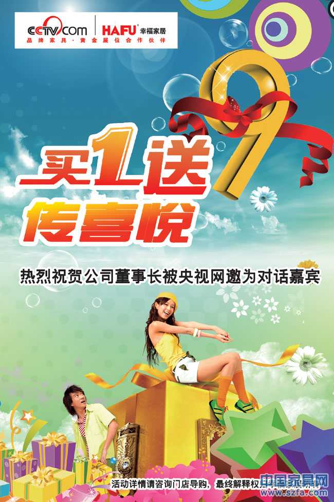 為熱烈慶祝廣州家具品牌幸福家居董事長受央視網榮譽邀請為對話嘉賓,現廣廣州家具品牌幸福家居推出“買一送九”,超優惠活動,客戶凡在幸福家居消費滿4999元,即可享受幸福家居送出的九件實用家居禮品!機會不等人,等人的不是好機會,大家快快行動起來吧!