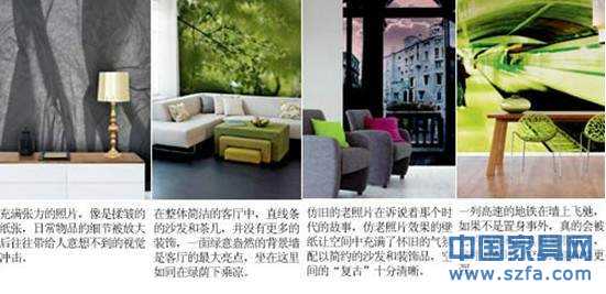 一、用 “ 模仿 ” 提升樂趣 性價比指數: ★★★☆☆ 玩 “ 墻 ” 指數: ★★★★☆ 視覺沖擊指數: ★★★★★ 隨著各種 “ 模仿 ” 秀的不斷升級,壁紙也緊跟時尚的腳步, 1 仿照片效果的壁紙帶來了強烈的視覺沖擊力,把空間的裝飾效果推上頂點。 打造要點:局部裝飾 + 具象圖案 整體效果:仿照片效果的壁紙跟以往的照片裝飾有所不同,用整面墻去訴說一個主題,給人帶來的是超乎尋常的視覺震撼,用這樣的壁紙作為房間的背景, 1 其它的家什似乎都黯淡了下來,或者說,不用特別地精心布置,擁有仿照片效果的大氛圍已經注定了這樣的空間會不同尋常,仿照片效果的壁紙通常采用局部鋪貼的手法,因為,局部的裝點已經可以給空間帶來足夠的影響力,仿照片效果壁紙的 “ 照片 ” 內容十分具象,建筑、人物、花草 …… 但逼真的程度足以以假亂真,讓人同時體驗著壁紙與影像帶來的空間樂趣。