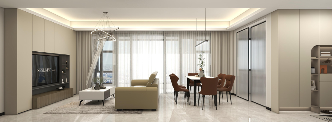 低飽和度色的空間,極簡而克制,彰顯留白的藝術(shù)美感;凹陷式電視背景墻,集儲物于一體;吊頂嵌入線燈,營造舒展的空間氛圍,造型新穎的吊燈成為點綴,更添意趣。