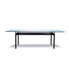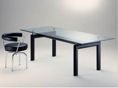 LC6餐桌底部是焊接鋼制,表面黑色烤漆或者不銹鋼拋光,桌子可以選升降和固定高度。臺面由15mm或19mm鋼化玻璃桌面。