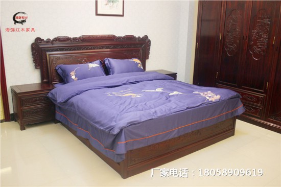 床頭柜上下兩個抽屜,與床箱雕刻相統一,手工打磨的元寶型凹槽拉手,