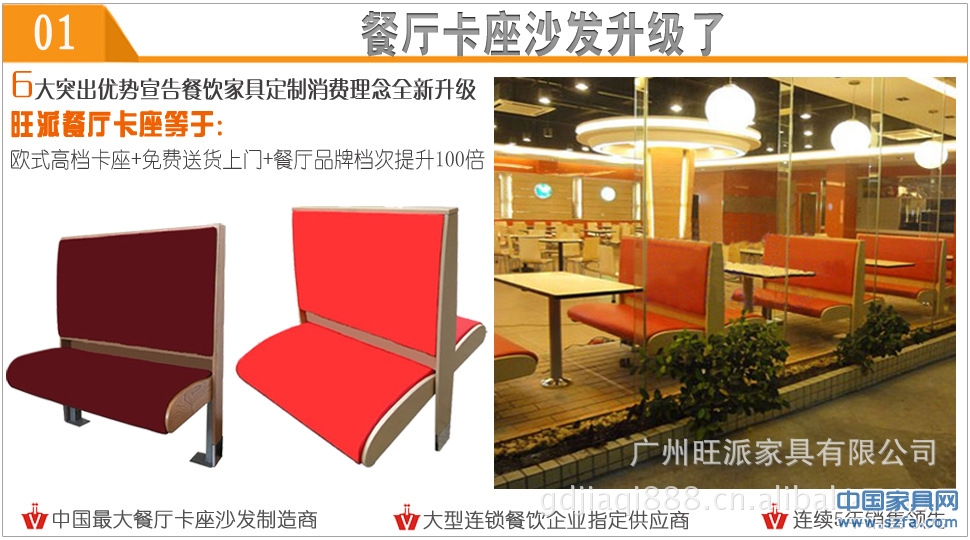 廣東旺派家具有限公司是廣東著名家具企業,經過廣州市工商局注冊的企業.廣東生產基地位于享有國際家具商貿之都美譽的佛山市順德區,在國內擁有30000平方米的廠房和一流的生產設備,各類技術管理及高級技師等500多人,在國外有10000于平方米的工廠,200多名工人。廣東旺派家具有限公司主要從事餐飲家具的研發、生產、銷售、服務和外貿出口以及品牌經營為一體的大型實業公司,是一家致力于餐飲家具服務領域中具有高度專業性的現代化服務行業領跑者.主要生產經營餐廳卡座沙發,麥當勞卡座沙發,肯德基卡座沙發,必勝客卡座沙發桌椅,茶餐廳卡座沙發桌椅,西餐廳卡座沙發桌椅,咖啡廳桌椅沙發,快餐廳桌椅沙發,專業為客戶提供完善的產品設計、工程設計方案、售后服務,旺派卡座沙發成功將卡座沙發皮革耐磨的使用壽命延長3倍以上,為滿足全國各地的需求,現我廠推出全國范圍內免費專線物流送貨上門.