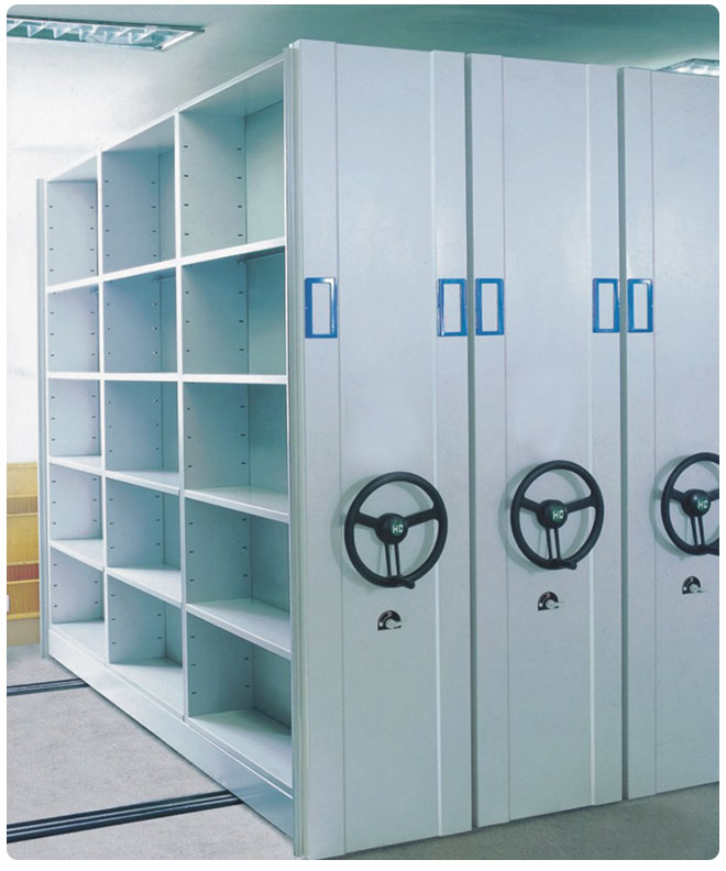 全封閉密集柜基座整體焊接合拼,架體為特殊立板插入結構,立板中開有掛孔;擱板扣置于掛孔上;每層擱板一分為二,雙面擱板間距可分別上下調節。每節雙面間以整板分隔開。 側面板可采用凹凸式護板或三段式護板,該樣式密集架適用于要求承重大且密封要求高的庫房,被稱為“全封閉”型。