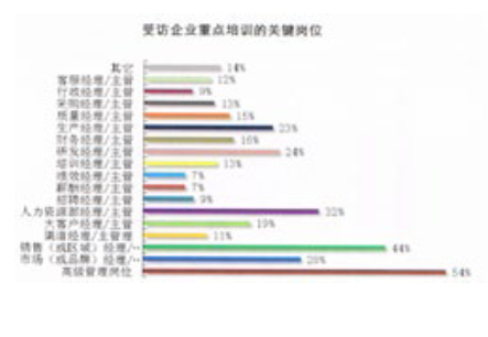 54%的企業將“高級管理崗位”作為企業重點培訓的關鍵崗位,“銷售經理”以44%位居專職崗位第一,“生產、研發、人力資源、財務、市場”等皆屬于企業重點培訓的關鍵。