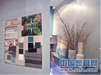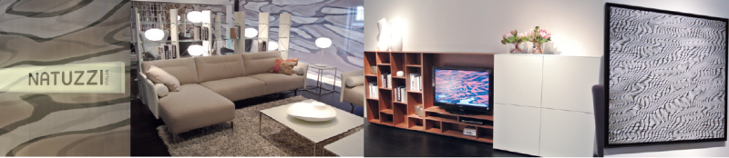 NATUZZI今年聘用專業的水體攝影師Gianni Basso,讓其用攝影加抽象的手法,表達水的多姿和靈動。整個展廳的墻面裝飾通體為變形的水波紋,其曲柔的形態沖淡家具形體的生硬,貌似流淌的靈動感賦予家具無限的生命力。
