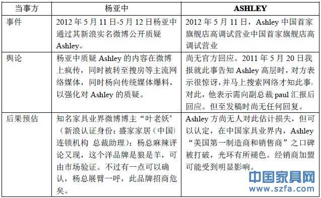 試比較2011年,楊亞中曾有意和Ashley合作,并專程到美考察,同時在“中國實木家具發展論壇”還高調稱贊Ashley,認為其去Ashley參觀的最大心得就是:要以消費者需求為導向。雙方從行動上的“合作”、態度上的“和諧”到如今行動上的“分裂”、態度上的“炮轟”,僅僅一年功夫,這一年到底發生了什么,從而形成如此巨大的大落差——為什么會有這樣的落差?