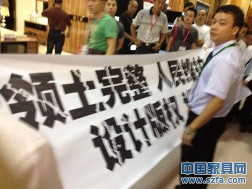 第二天,澳瑪十數名員工在城市戀人家具拉橫幅進行維權"橫幅上印著“領土完整,人民維權,設計版權,誰來做主?。⒌淖志?。