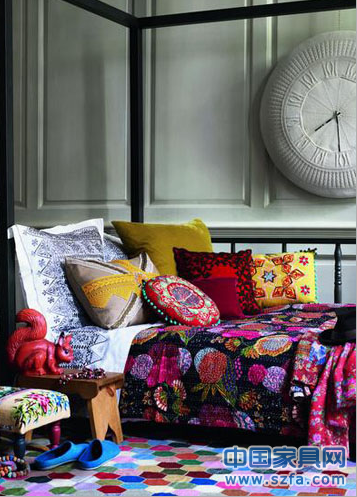 臥室的設計中加入傳統的元素會使人感到很親切,讓人情不自禁地想要在床上盤腿坐下或者蜷起身子躺下,設計師把靠墊和有粗大針腳的床單混搭在一起,為人們營造出一個舒適的安樂窩。你可以在設計中加入一些古怪的物件,但是一定要讓人看上去是很柔和很柔和的……