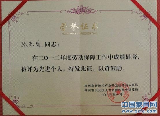 2013年元月16日,由株洲高新技術產業開發區勞動人事局、株洲市天元區人力資源和社會保障局聯合主辦的“2012年度勞動用工先進單位和先進個人表彰大會”在株洲市天元區高新大廈隆重舉行。湖南炎帝生物工程、蝶依斕家居布藝、株洲市華爾茲音樂等12家單位人力資源代表、各企業先進個人代表等參加了會議。高新區勞動監察大隊的夏隊長、蔣隊長出席大會并為受表彰企業和個人頒獎。蝶依斕榮獲“2012年度勞動用工先進單位”、蝶依斕董事副總經理張光明先生評為“2012年度先進個人”兩項獎。