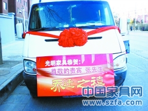 送貨車上掛大紅花和“喬遷之喜”的牌匾,給足客戶面子