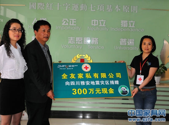 4月21日全友家居通過四川省紅十字會直接向災區捐款300萬元,同時號召全體員工和市場一線為地震災區捐款。不僅如此,全友家居還攜手阿里巴巴集團在崇州工業園基地建立了“聯合抗災物資中心”,第一時間整合自身的庫管和物流力量為來自全國各地的捐贈物資集中安排入庫、進行運輸,確保每一份捐贈物資及時安全地送到災區人民手里。