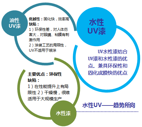 UV漆和水性漆都是環保漆的兩個發展方向,UV光固化體系以其固化速度快、生產效率高、涂層物化性能好等優勢,在近多年來得到了高速發展。但是,傳統的油性UV在應用時存在著局限性:首先從環保角度,油性UV揮發性強,對人的眼睛和粘膜有較強的刺激作用,皮膚接觸也易導致過敏。同時許多油性UV反應性稀釋劑在紫外光固化過程中難以反應完全,直接影響著固化后產品的衛生安全性能。其次從涂裝工藝上看,在噴涂方面一直是油性UV的短板,不管是安全性,環保等各種因素,傳統的油性UV是很難適用于噴涂的。