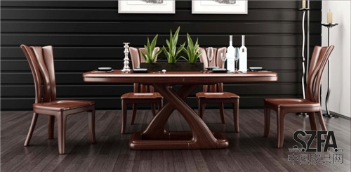 產品為現代實木風格,材質為核桃木。餐桌對稱交錯的支撐方式的靈感來源于一對旋轉飛升的彩綢,椅子靠背的造型靈感則來源于含苞待放的郁金香。把生活中不經意的審美情感巧妙地融入到了設計中是我們的慣用手法。
