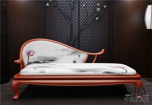 產品為現代中式風格,材質為緬甸花梨加水墨印花棉麻布。設計手法上在傳統明清家具的經典形制上加入了一些現代元素,把圈椅舒適線條流暢的特征與羅漢床結合并配以水墨印花軟包,使之更加符合當下人們時尚、簡約、舒適、的生活方式。