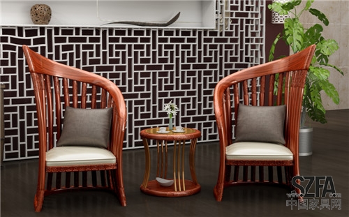 產品為現代中式風格,材質為緬甸花梨加進口小羊皮。設計靈感來源于書法的流暢線條和中國的古琴,在中國傳統審美核心“韻律感”中追求靜與動的對立與統一。整套產品猶如空中一對搖曳的音符通透空靈。休閑幾上金屬配件的融入也給傳統中式家具增加了新的審美情趣。