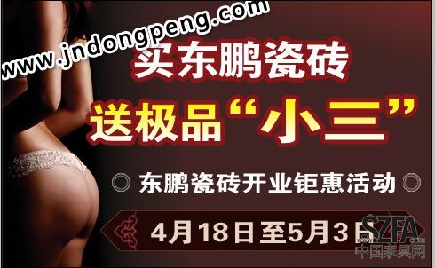 那么,4月18日——5月3日,濟南東鵬瓷磚開始送“新”意了,相信這個“新”意不僅開行業之先河,而且更是一份足以撼動所有消費者的大心意。究竟極品“小三”花落誰家?相信只要參與,濟南東鵬的此次活動就會帶給您足夠的震撼與驚喜!