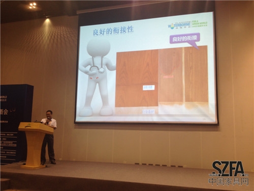 展辰涂料UV及水性漆事業部水性漆項目經理陳傳印在酒會上做了《水性涂裝方案在美式涂裝上的應用》的主題匯報,根據目前當下流行的各種美式涂裝,結合已在成功應用的成功案例,向與會嘉賓們介紹了展辰的水性產品涂裝方案。展辰涂料以深耕水性木器漆行業多年的專業經驗,已成功幫助白玉蘭、曲美、朝陽及富凱等知名企業完成水性環保涂裝的轉型,使其擺脫環保壓力的同時取得企業的迅猛發展。