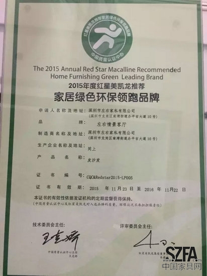 左右沙發不僅在設計領域與銷售業績上遙遙領先,作為紅星美凱龍百強合作伙伴,左右還被紅星美凱龍推薦、中國質量認證中心認證為家居綠色環保領先品牌。