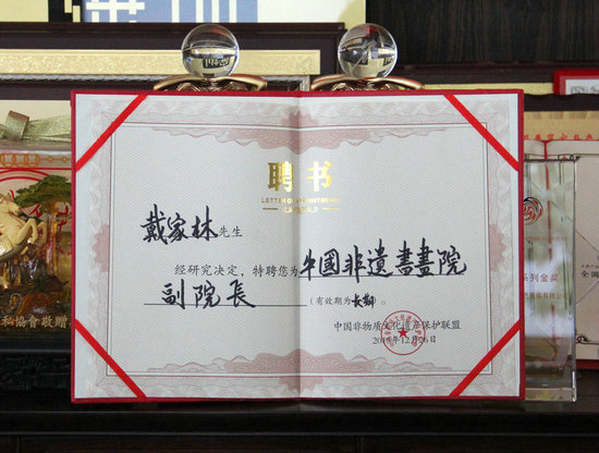 2015年12月26日,祥利集團(tuán)董事長(zhǎng)戴家林先生被中國(guó)非物質(zhì)文化遺產(chǎn)保護(hù)聯(lián)盟特聘為中國(guó)非遺書畫院副院長(zhǎng),日前,聘任書已送達(dá)祥利集團(tuán)。