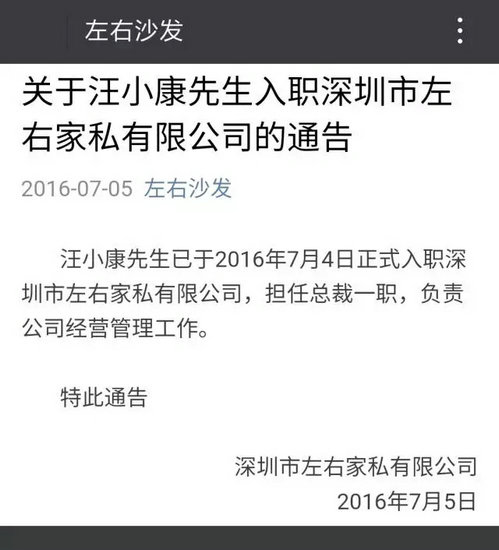 2016年7月4日,左右家私迎來一位新的總裁——汪小康,負責公司經營管理工作。