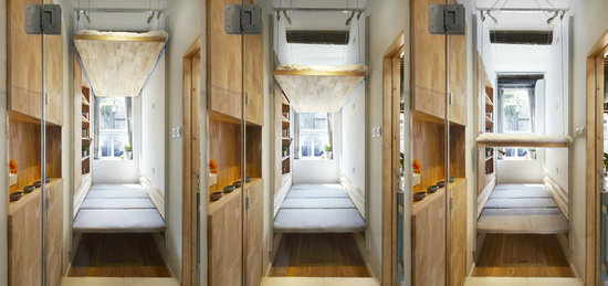 王鵬家3.7平米的小居室設計,利用中國古代科舉考場“號舍”座位的思維,將木板放在五種不同高度實現茶室和臥室的切換,以實現小空間的可變性。不銹鋼線和電機設計的升降床板的現代技術,配合海福樂功能五金配件的嬌小身材,動靜間實現了“麻雀雖小五臟俱全”的居家享受。