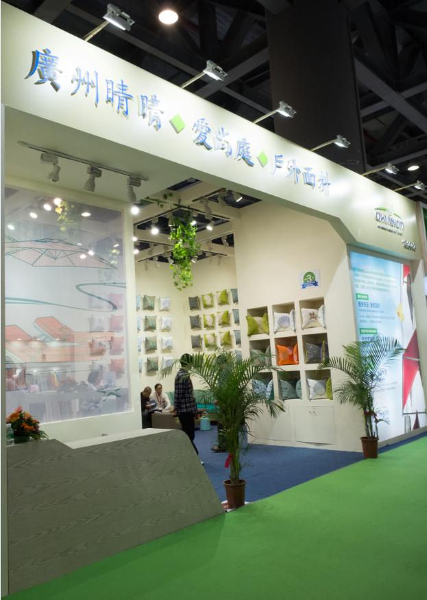 晴晴旗下的axvision(愛尚庭)室外多功能布搭配穩定可靠的著色工藝以及細膩短長纖混織, 使得材質軟硬適中且高強度拉力。愛尚庭多功能布料在使用中,不僅壽命長、色牢度穩定、抗曬等級達到ISO105B02/B04標準的7-8級(最高為8級),而且布料全面經抗紫外線處理, 日光保護指數可達UPF 50+,深受消費者喜愛,整個生產過程安全環保,很快在戶外布料行業中脫穎而出。(如圖是2017CIFF 18.2C02展位展品圖)