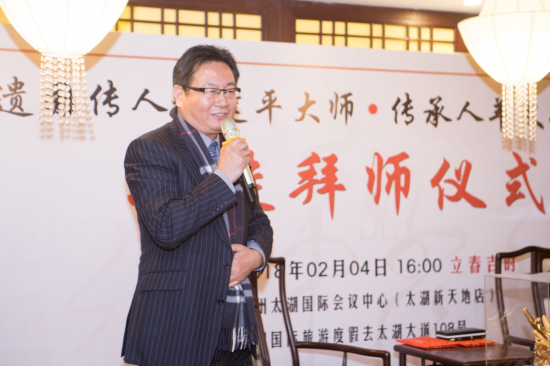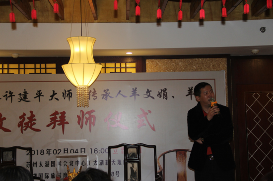 2月4日,蘇州太湖之濱的蘇州太湖國際會議中心暖意融融,國家級非物質文化遺產項目明式家具制作技藝代表性傳承人、吳門大家創始人許建平大師收徒儀式隆重舉行,羊文娟、羊洋姐妹正式成為許大師的第二十、二十一位入室弟子。蘇州家具協會會長顧志浩、蘇州家具協會秘書長石磊、蘇州家具協會紅木家具專業委員會主任宋衛東、蘇州非遺辦副主任張嵐、蘇州家具協會秘書倪國梁、上海視覺學院手作教授陳彤、兩岸著名室內設計師白慶聰、上海寶鋼宣傳部部長楊小川以及吳門大家的其他十多位師兄弟等共同見證了盛況。