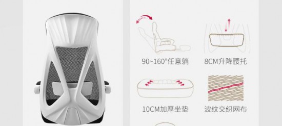 家具結構越符合人體力學原理,運用的舒適程度就會越高,專業的人體工學設計,讓黑白調電腦椅產品始終保持高水準的舒適度,人性化的設計在HDNY077的設計上體現的淋漓盡致。在功能上,90-160度后仰設計,8cm可調節腰托、聯動扶手設計等,最大化的考慮到了人體在使用過程中的感受,針對性的解決每個部位遇到的問題,緩解久坐對背部、脊椎、腰部帶來的壓力,讓久坐更健康。