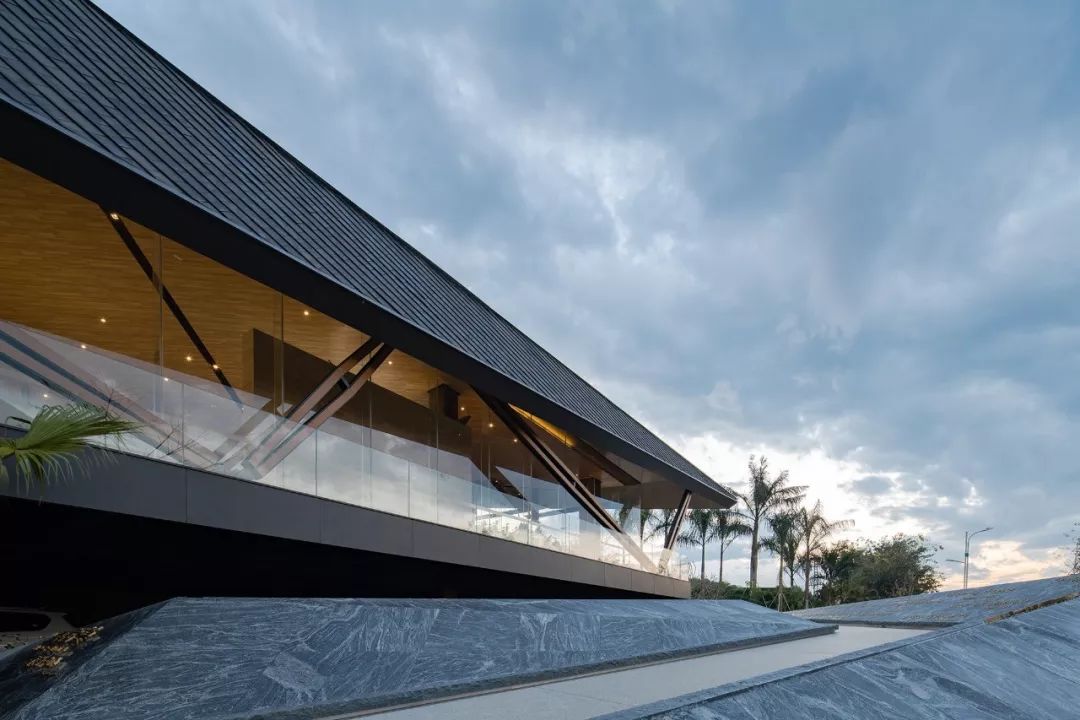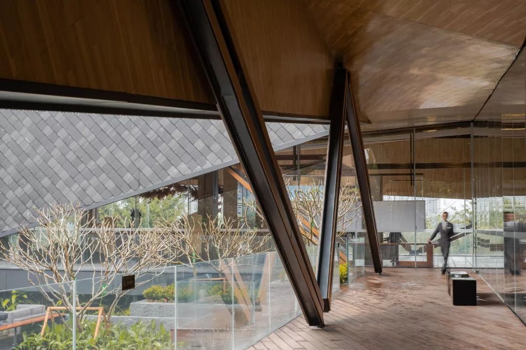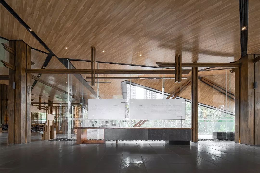 建筑設計通透開放,自由的屋頂結合靈活的異形結構,同生機勃勃的自然環境相融共生。室內延續建筑所賦予的意義,以其為載體,在室內空間延展、重組,詮釋其所構成的涵義。