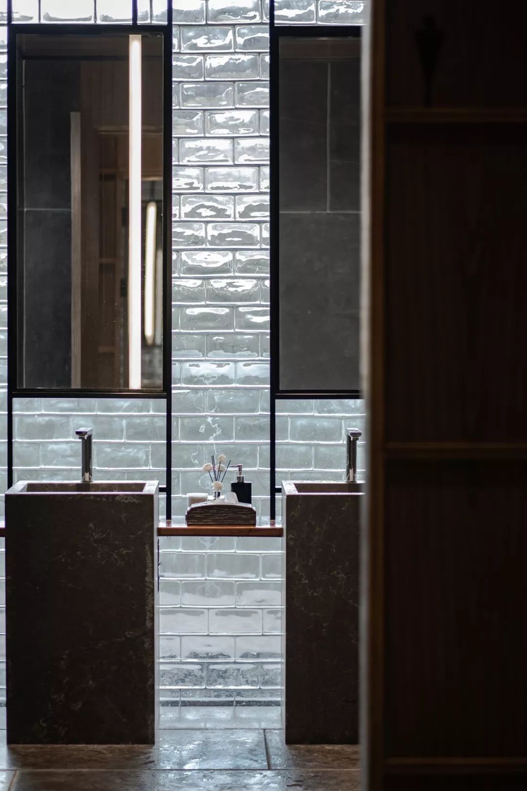 設計師將木、土、玻璃這樣的自然材質以現代手法的轉化,保留最質樸的一面。透明玻璃磚的使用,使得即便是洗手間,也有光影的舞蹈,躍動出空間的張力。