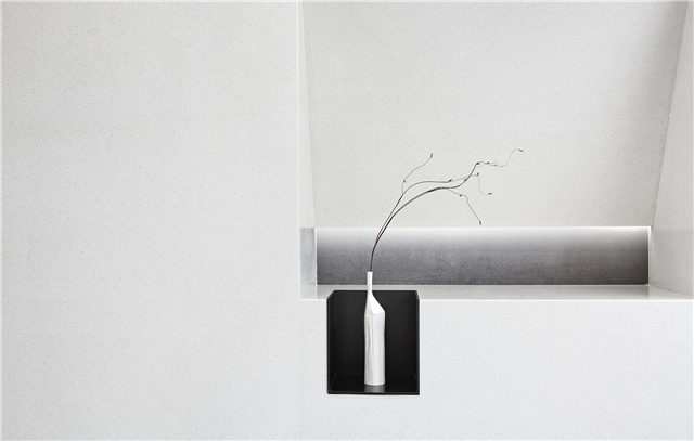 折角、切割、延伸……融合當代建筑設計語言,通過材質(zhì)與線條的切換,由淺至深的色塊理性組合,層層遞進,搭配斜頂天花下靈動變幻的光束,營造出純凈雅靜的空間氣息。