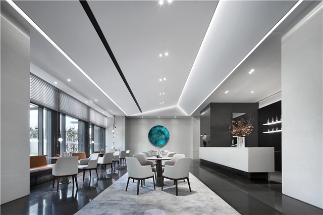 光與影共存,就像深度洽談區(qū),設計師將光作為獨立的材質(zhì)滲透到空間的各個角落。