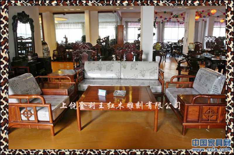 上饒市金利王紅木雕刻有限公司,座落于江西省上饒市經濟開發區鳳凰園區,是一家專門從事中高檔紅木家具生產的專業廠家。本公司視質量與信譽為企業生存和發展的根本,潛心為客戶的利益而開發創新各種款式別致的優質產品。本公司產品選材于東南亞進口的黃花梨、紫檀、酸枝、緬甸花梨等珍貴紅木,其特點色澤深沉、質地精密、紋理細膩。公司擁有精湛的技術,產品手工制作,名師打理,設計精美,制作精巧,榫卯牢固,舒適耐用。既傳承傳統的雕刻技術,研發古典藝術家具,又融入了新的潮流構思,其人、物、花、鳥栩栩如生,龍、鳳、獅、虎神采飛揚,富含東方神韻,各類產品深受廣大消費者和藝術愛好者的親睞。