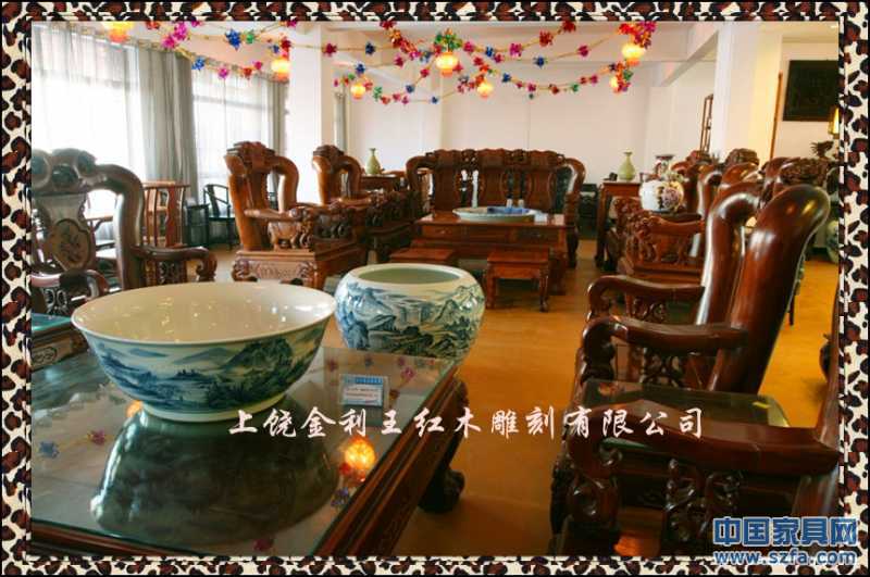 上饒市金利王紅木雕刻有限公司,座落于江西省上饒市經濟開發區鳳凰園區,是一家專門從事中高檔紅木家具生產的專業廠家。本公司視質量與信譽為企業生存和發展的根本,潛心為客戶的利益而開發創新各種款式別致的優質產品。本公司產品選材于東南亞進口的黃花梨、紫檀、酸枝、緬甸花梨等珍貴紅木,其特點色澤深沉、質地精密、紋理細膩。公司擁有精湛的技術,產品手工制作,名師打理,設計精美,制作精巧,榫卯牢固,舒適耐用。既傳承傳統的雕刻技術,研發古典藝術家具,又融入了新的潮流構思,其人、物、花、鳥栩栩如生,龍、鳳、獅、虎神采飛揚,富含東方神韻,各類產品深受廣大消費者和藝術愛好者的親睞。