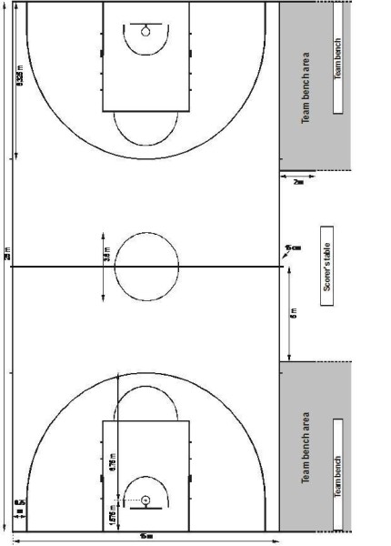 球隊席區(qū)域應(yīng)標(biāo)在記錄臺和球隊成同側(cè)的場外。每個區(qū)域由一條從端線向外延伸至少長2米的線和另一條離中線5米且與邊線成直角并至少長2米的線所限定。球隊席區(qū)域內(nèi)必須有14個座位供教練員、替補隊員使用。任何其他人員應(yīng)在球隊席后面至少2米處。