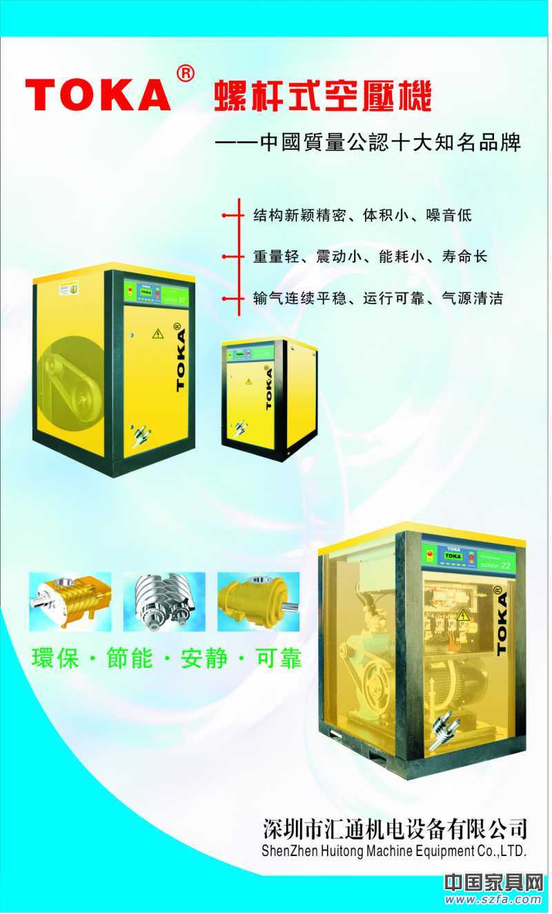 TOKA®(特高)牌螺桿式空壓機、活塞式空壓機、儲氣罐、冷凍式干燥機、吸附式干燥機、過濾器等設備;設計制造:車間水簾負壓降溫工程、不燒油不燒電的企業熱水工程。TOKA®牌空壓機被評為2007年中國質量公認十大知名品牌。