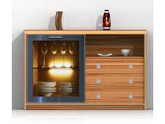 該款餐柜主體材質采用德國進口櫸木,其余部分三聚氰胺環保板,櫸木木性堅韌,紋理通達清晰,創面光滑,花紋美麗,是家具主要用材之一。選用知名品牌的華潤油漆經過十二道工序,透明涂飾,木紋清晰可見。一個玻璃柜門起到較好的裝飾作用。新中式風格,款式新穎、造型簡單實用,小巧精致的造型更能體現精致的生活環境
