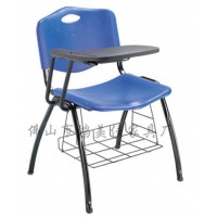 座板、靠背及寫字板均采用高純度原生PP(聚丙烯)工程塑膠料,經低溫一次性模具注塑成型,座板、背板及寫字板膠板有黑色、深藍、淺灰三種顏色可選,,優質低碳A3冷扎鋼管表面酸洗、磷化及高溫靜電噴涂腳架,產品座面與靠背可視需要增加飾布軟墊,布料顏色可選!可選擇配置吊籃(書藍/書網/書框);